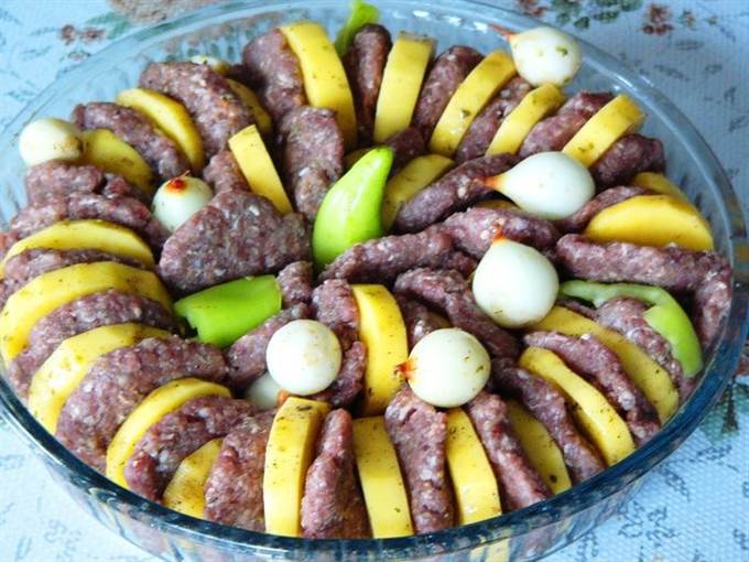 Выкладываем котлеты и овощи на блюдо для запекания, чередуя: котлета-картошка-лук и так далее (можно оставить только картофель и котлеты). У меня в этот раз был лук-шалот. Чеснок раскладываем в промежутки. -