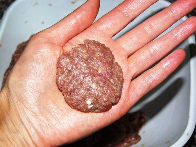 Фарш хорошо вымесить. Слепить небольшие котлетки круглой формы. Их надо немного приплющить, чтобы стали плоскими. Складываем котлетки в миску и отставляем в сторону.