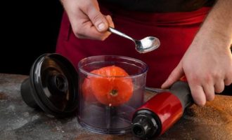 • Томаты ошпарить кипятком и снять кожицу. В блендере измельчить до однородного состояния.