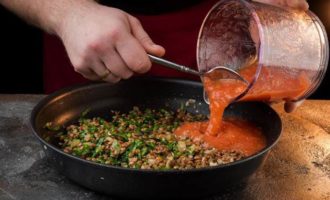 • Добавить томаты к чечевице и протушить на медленном огне 5 минут.