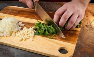• Лук и чеснок нарезать мелко и обжарить на растительном масле.