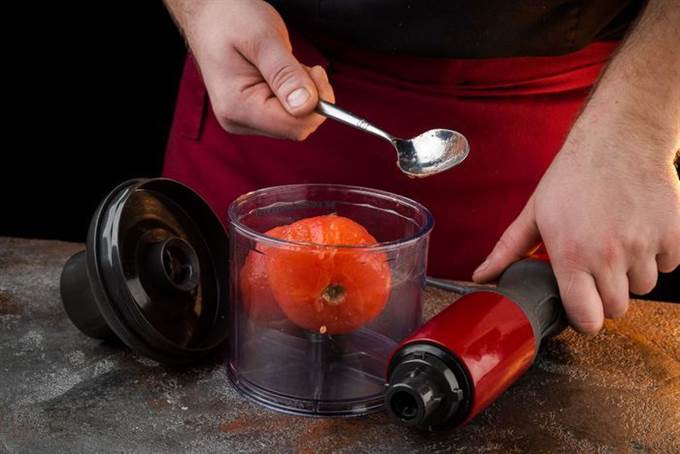 • Томаты ошпарить кипятком и снять кожицу. В блендере измельчить до однородного состояния.