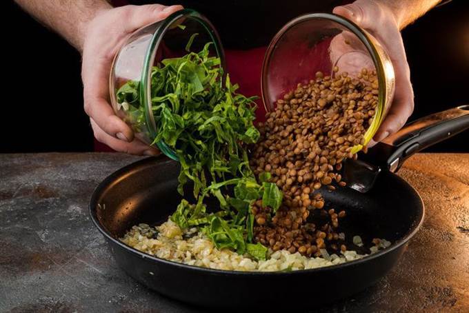 • Добавить томаты к чечевице и протушить на медленном огне 5 минут.