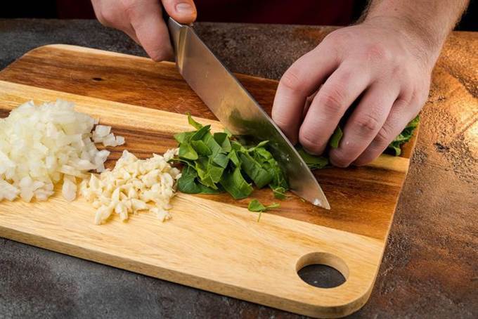 • Лук и чеснок нарезать мелко и обжарить на растительном масле.