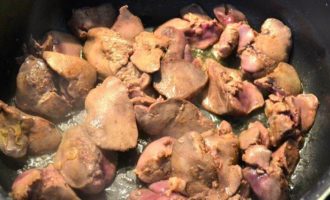 • Куриную печень промыть и нарезать не очень мелкими кусочками. Разогреть 1 ст. л. оливкового масла в большой сковороде и слегка обжарить куриную печенку на умеренном огне. Выложить ее на тарелку, закрыть и отложить.