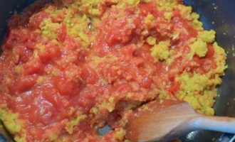 • Свежие помидоры очистить от кожицы и нарезать. (я использовала помидорки-черри). Добавить к овощной смеси свежие и консервированные томаты и довести до кипения. Убавить огонь и тушить, помешивая время от времени, 10 минут, пока смесь не загустеет.