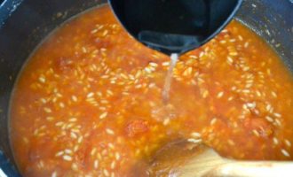 • Влить четвертую часть горячего бульона и довести до кипения. Убавить огонь и тушить, время от времени помешивая, пока весь бульон не впитается. Повторить, добавляя по 200 мл бульона; перед тем как влить новую порцию, убедитесь, что предыдущая полностью впиталась.