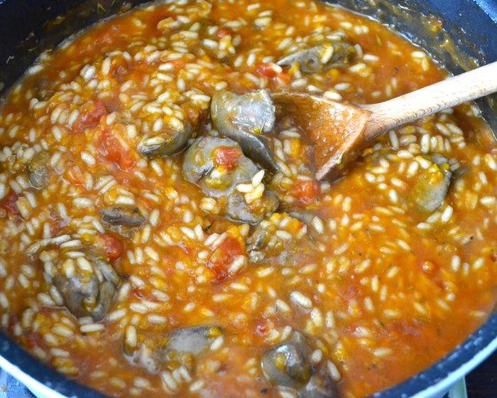 • Минут за 5 до готовности ризотто положить в сковороду куриную печенку, чабрец и черный перец в зернах (предварительно растолочь в ступке или разбить молотком, положив в прочный полиэтиленовый пакет. Я значительно уменьшила количество перца, т. к. блюдо готовила в первую очередь для детей). Посолить…
