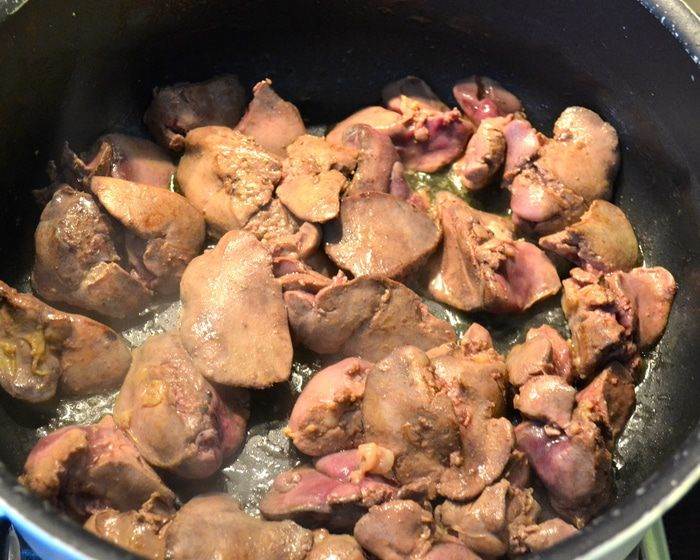 • Куриную печень промыть и нарезать не очень мелкими кусочками. Разогреть 1 ст. л. оливкового масла в большой сковороде и слегка обжарить куриную печенку на умеренном огне. Выложить ее на тарелку, закрыть и отложить.