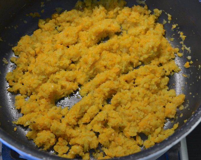 • Разогреть в сковороде оставшееся масло и жарить лук, морковь и сельдерей 10 минут, помешивая.