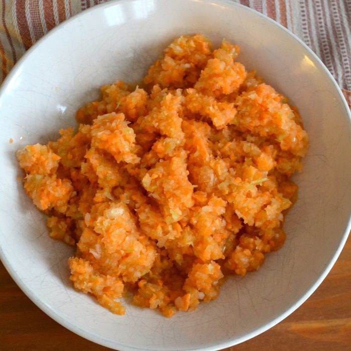 • Овощи (крупную луковицу, морковь и сельдерей) очистить и мелко нарезать. Я использую для этих целей блендер.