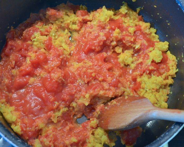 • Свежие помидоры очистить от кожицы и нарезать. (я использовала помидорки-черри). Добавить к овощной смеси свежие и консервированные томаты и довести до кипения. Убавить огонь и тушить, помешивая время от времени, 10 минут, пока смесь не загустеет.