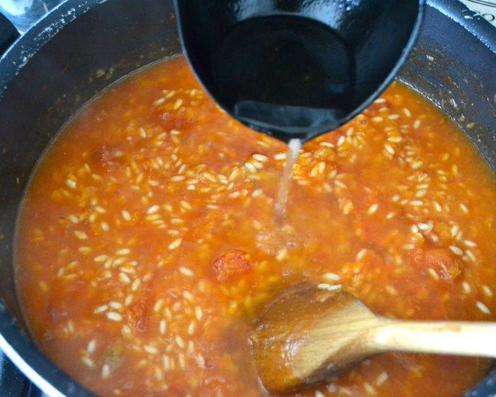 • Влить четвертую часть горячего бульона и довести до кипения. Убавить огонь и тушить, время от времени помешивая, пока весь бульон не впитается. Повторить, добавляя по 200 мл бульона; перед тем как влить новую порцию, убедитесь, что предыдущая полностью впиталась.