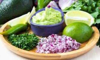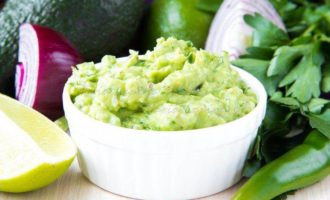 • Сделаем гуакамоле. Авокадо разделить на пополам, вытащить косточку, а мякоть достать ложкой. Мякоть можно помять вилкой или воспользоваться блендером. Но главное сильно не увлекаться, т. к. соус не должен быть полностью однородным, кусочки авокадо приветствуются. Очень мелко нашинковать лук, петрушку и перец чили.