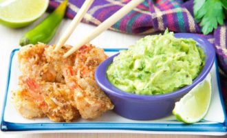 • Креветки сначала выложить на бумажное полотенце, чтобы убрать лишний жир и масло. Затем выкладываем на тарелку и подаем с соусом гуакамоле и ломтиком лайма.