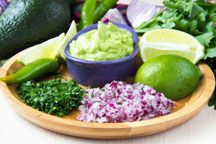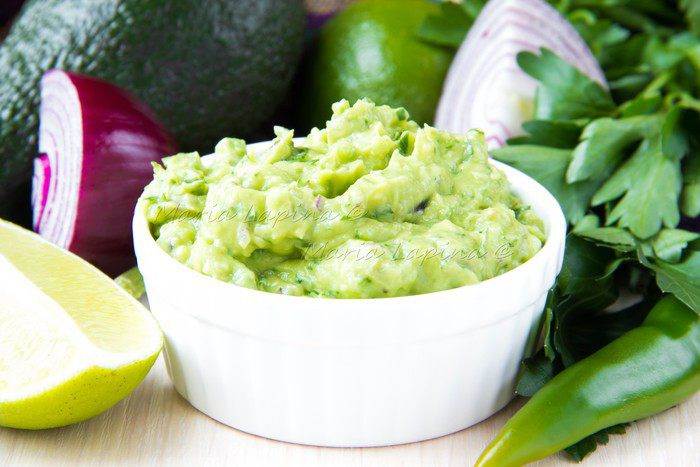 • Сделаем гуакамоле. Авокадо разделить на пополам, вытащить косточку, а мякоть достать ложкой. Мякоть можно помять вилкой или воспользоваться блендером. Но главное сильно не увлекаться, т. к. соус не должен быть полностью однородным, кусочки авокадо приветствуются. Очень мелко нашинковать лук, петрушку и перец чили.