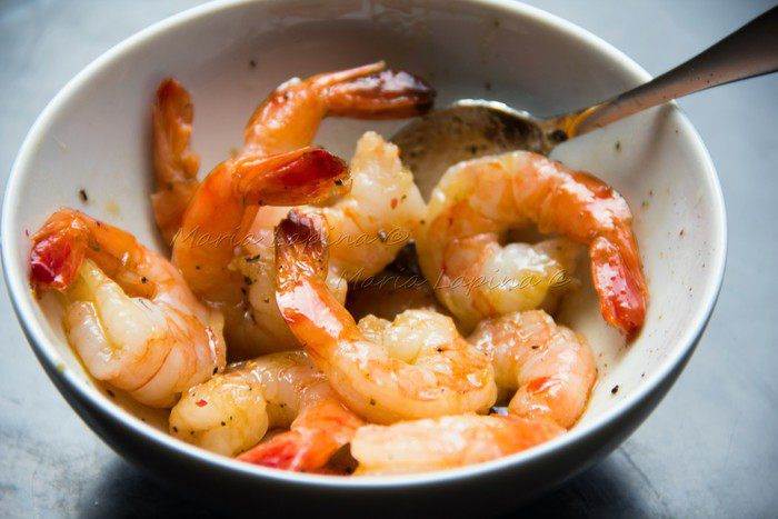 • Опустим в маринад креветки оставим хотя бы на 15 минут. Креветки можно использовать как уже отваренные, так и сырые. Просто для сырых потребуется чуть больше времени при обжарке.