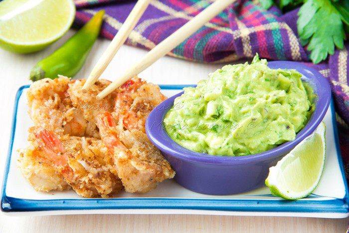• Креветки сначала выложить на бумажное полотенце, чтобы убрать лишний жир и масло. Затем выкладываем на тарелку и подаем с соусом гуакамоле и ломтиком лайма.