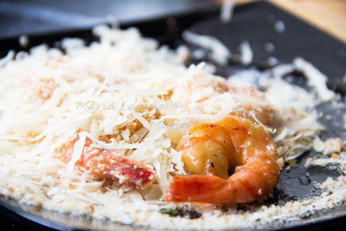 • Креветки обвалять в сырной панировке и обжарить на сильном огне в большом количестве масла. Если используете готовые креветки, то хватит и 10-15 секунд на каждой стороне. Жарить лучше партиями по 3-4 штуки, чтобы успевать за ними следить. Если же креветки сырые, то увеличить время и уменьшить огонь, а можно и вовсе запечь.