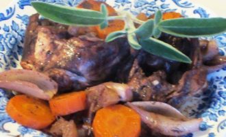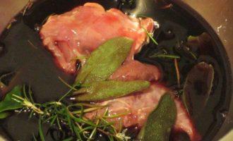 Помыть кролика в холодной воде с добавлением уксуса, обсушить бумажным полотенцем, поместить в миску. Добавить розмарин, шалфей, лавровый лист, раздавленный чеснок, залить вином, закрыть плёнкой и поставить мариноваться в холодильник минимум на 6 часов.