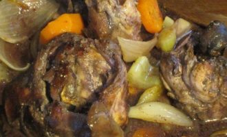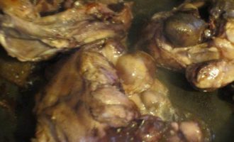 Кролика поместить к овощам, влить профильтрованный винный маринад, посолить, поперчить, накрыть крышкой и тушить 30 минут. В 1/2 ст. тёплого бульона развести томатный концентрат, влить в сковороду и тушить ещё 30 минут.