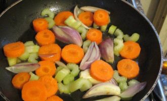 Крупно нарезать лук, сельдерей, морковь и обжарить в глубокой сковороде с 3 ст. л. оливкового масла на слабом огне 4-5 минут.