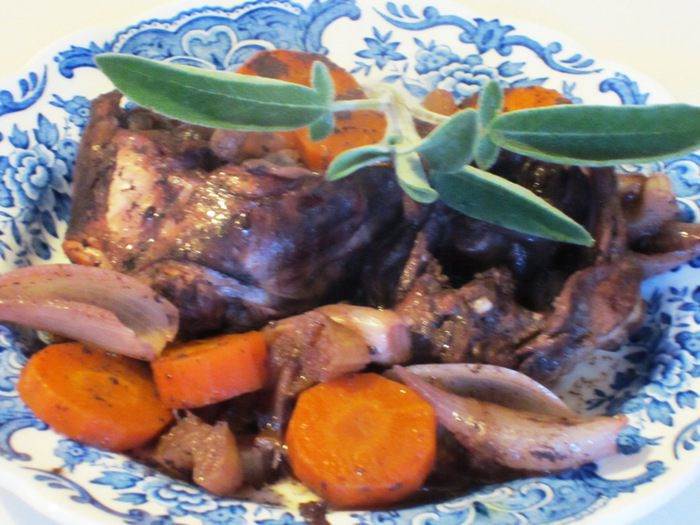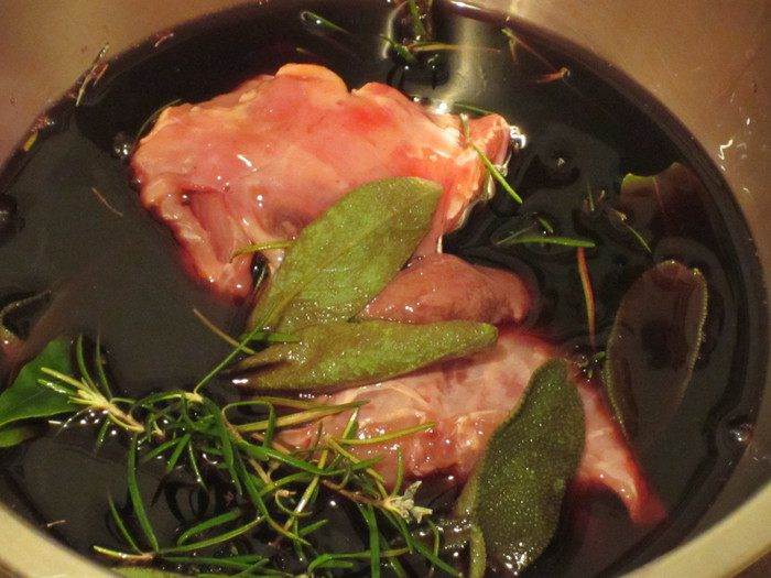 Помыть кролика в холодной воде с добавлением уксуса, обсушить бумажным полотенцем, поместить в миску. Добавить розмарин, шалфей, лавровый лист, раздавленный чеснок, залить вином, закрыть плёнкой и поставить мариноваться в холодильник минимум на 6 часов.