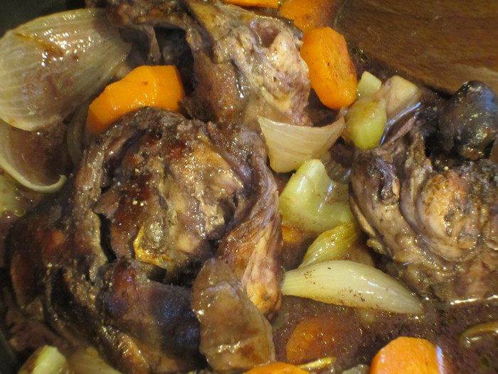 Кролика поместить к овощам, влить профильтрованный винный маринад, посолить, поперчить, накрыть крышкой и тушить 30 минут. В 1/2 ст. тёплого бульона развести томатный концентрат, влить в сковороду и тушить ещё 30 минут.