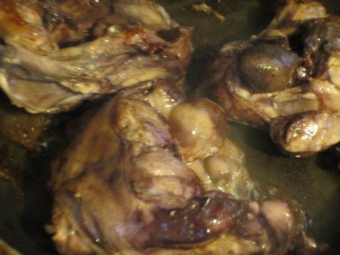 Вынуть кролика из маринада и подсушить на сковороде с антипригарным покрытием на сильном огне 10 минут.