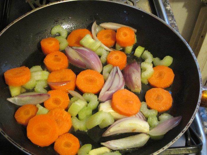 Крупно нарезать лук, сельдерей, морковь и обжарить в глубокой сковороде с 3 ст. л. оливкового масла на слабом огне 4-5 минут.