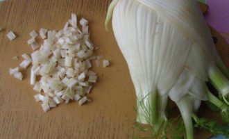 Лук и клубень фенхеля мелко порезать, натереть морковь на крупной терке.