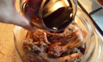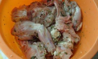 Порубить тушку кролика на порционные куски и замариновать в маринаде на 2-3 часа.