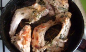 Куски кролика обжарить на оливковом масле до образования золотистой корочки.