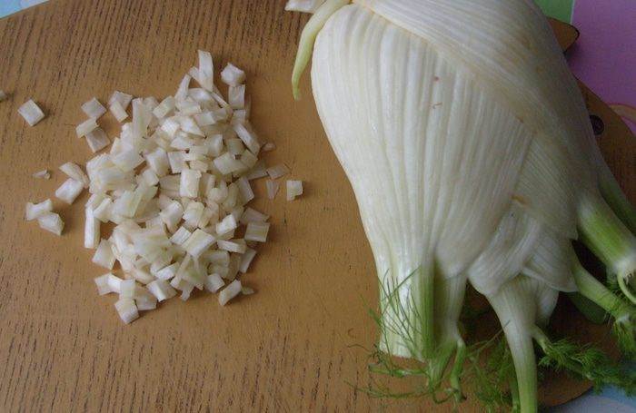 Лук и клубень фенхеля мелко порезать, натереть морковь на крупной терке.