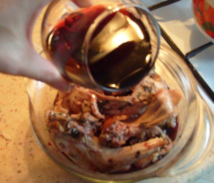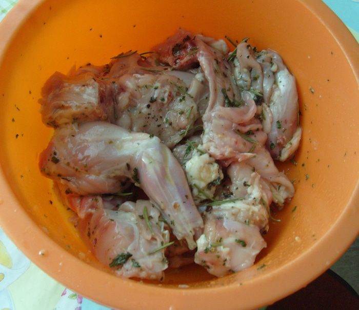 Порубить тушку кролика на порционные куски и замариновать в маринаде на 2-3 часа.