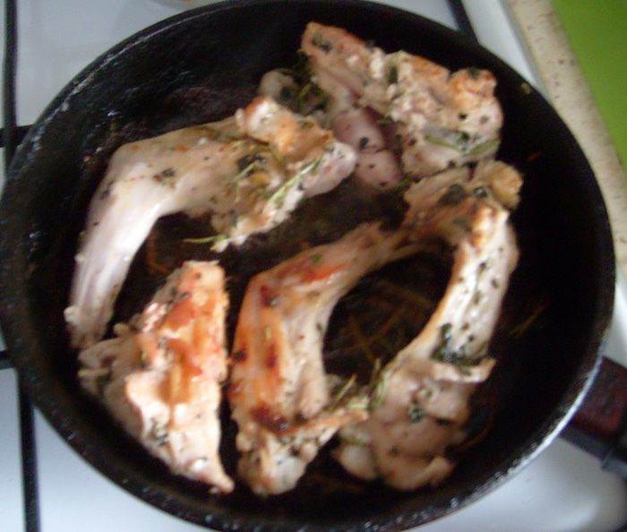 Куски кролика обжарить на оливковом масле до образования золотистой корочки.