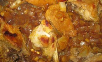 Достаем кролика из маринада и кладем его к луку. Маринад сохраняем. Солим перчим. Даем ему подрумянится.