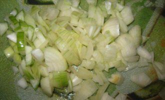 Мелко режем лук. Обжариваем его на медленном огне в оливковом масле пока не станет прозрачным.