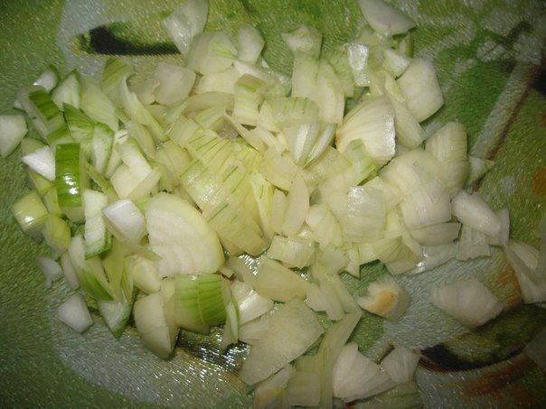 Мелко режем лук. Обжариваем его на медленном огне в оливковом масле пока не станет прозрачным.