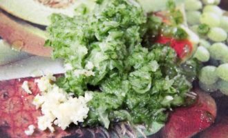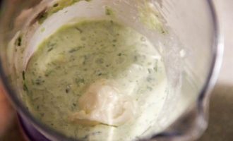 Итак, для белого соуса натереть огурец на мелкой терке, измельчить чеснок. Добавить сметану, соль и перец.