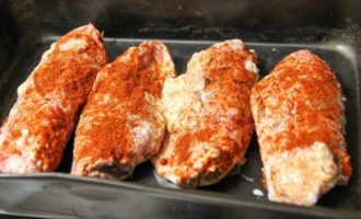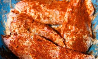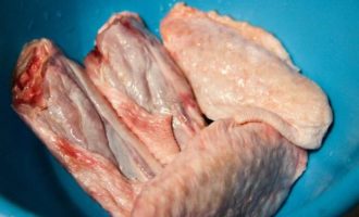 Обильно посыпать сладкой паприкой. Не бойтесь переусердствовать, в сочетании с мясом этой птицы и ее жирком, паприка особенно хороша! Оставить крылья минут на 30 мариноваться.