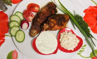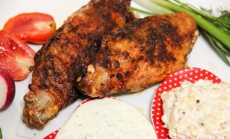 Готовые крылья подавать с соусами. Гарнир подойдет любой!