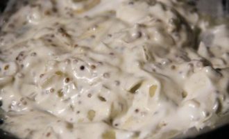 Теперь возьмемся за второй соус. Нарезать лук, растопить в сковороде сливочное масло и обжаривать лук до мягкости. Добавить уксус, два вида горчицы, сметану. Если хотите, чтобы соус был более жидким, влейте немного молока. Посолить и поперчить. Если кажется, что соус получился кисловатым, добавьте щепотку сахара.