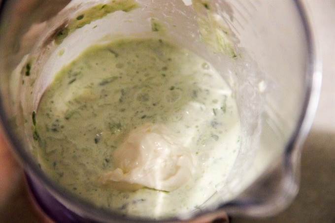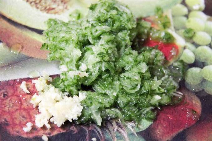 Итак, для белого соуса натереть огурец на мелкой терке, измельчить чеснок. Добавить сметану, соль и перец.
