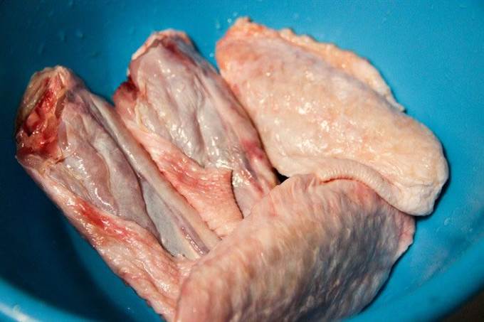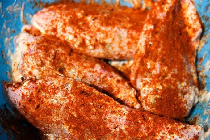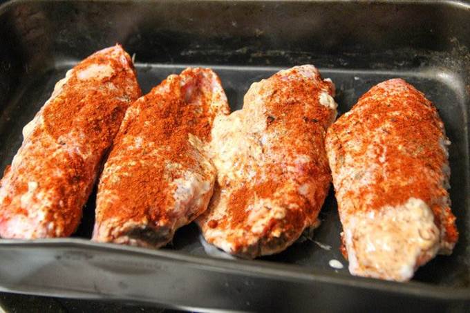 Обильно посыпать сладкой паприкой. Не бойтесь переусердствовать, в сочетании с мясом этой птицы и ее жирком, паприка особенно хороша! Оставить крылья минут на 30 мариноваться.