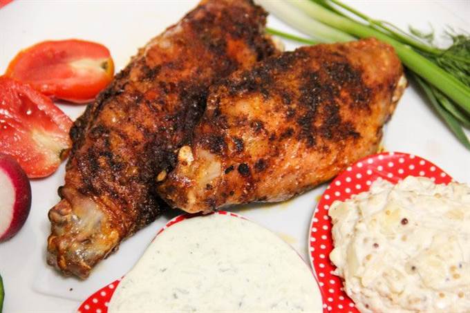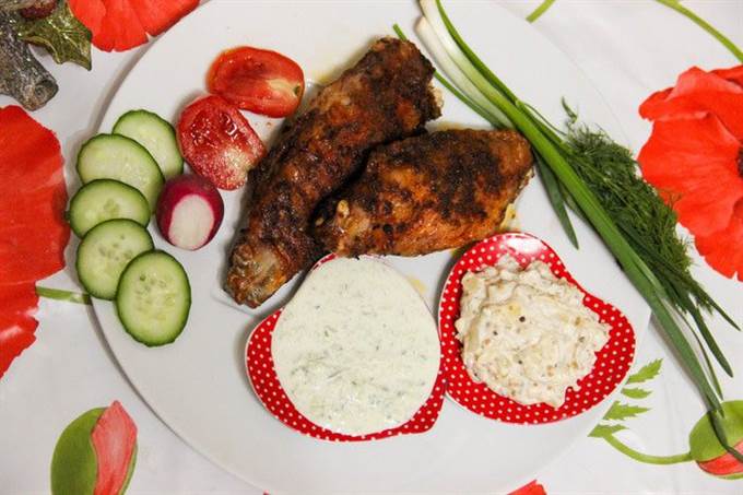 Готовые крылья подавать с соусами. Гарнир подойдет любой!