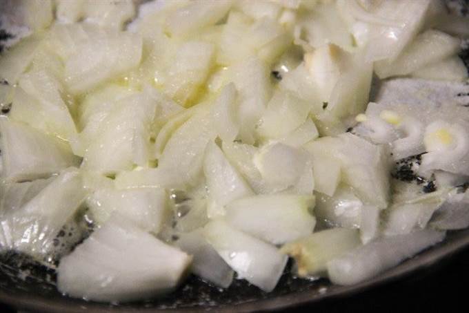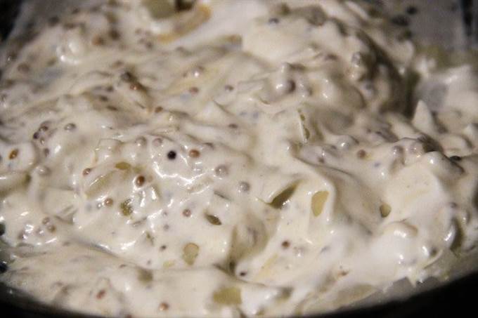 Теперь возьмемся за второй соус. Нарезать лук, растопить в сковороде сливочное масло и обжаривать лук до мягкости. Добавить уксус, два вида горчицы, сметану. Если хотите, чтобы соус был более жидким, влейте немного молока. Посолить и поперчить. Если кажется, что соус получился кисловатым, добавьте щепотку сахара.