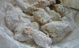 • Крылья по чистить, чеснок измельчить. Крылья положить в миску и посыпать крахмалом, хорошо перемешать что бы все крылышки были покрыты.