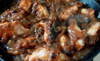• Маринад влить в сковороду, довести до легкого кипения и тушить пока слегка начнет густеть.