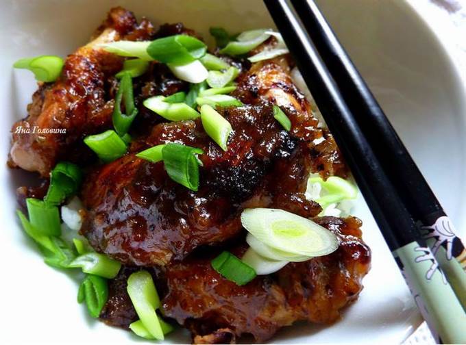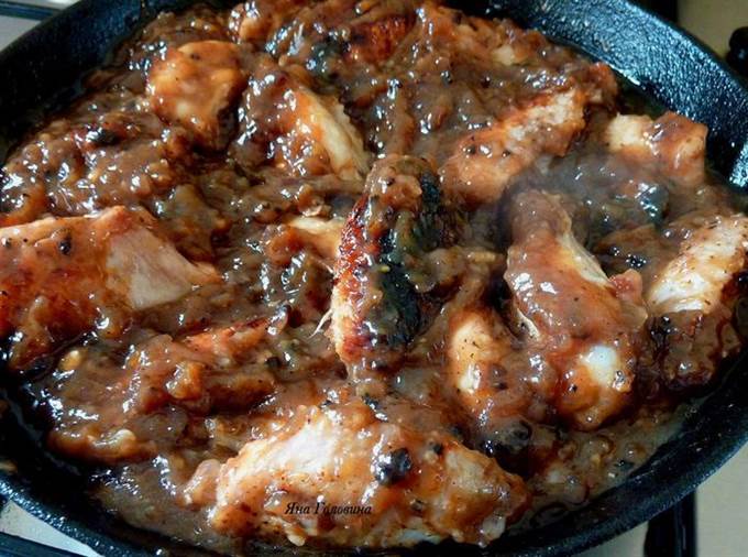 • Разогреть большую и тяжелую сковородку с маслом. Вынуть крылья из маринада (маринад сохранить) и обжарить по 7 минут с каждой стороны. По жаренные крылья отложить в сторону.
